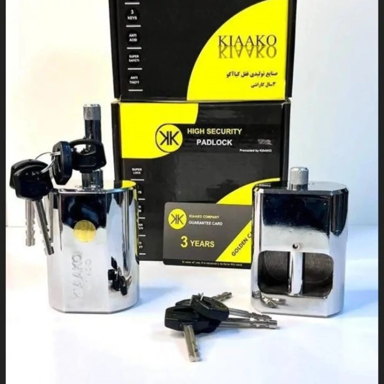 قفل پشت بسته ی کیاکو بدنه فولادی، ضد برش ، ضد اسید ، ضد سرقت، تعداد کلیدها چهار عدد، نوع مغزی دیسکی، جنس مغزی و کلیدها از برنج،